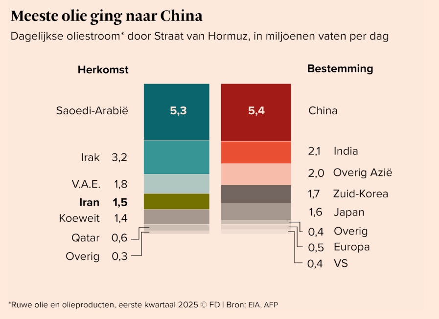 Maar wie kijkt naar de feitelijke stromen, ziet dat het grootste deel van de olie die hier passeert, bestemd is voor Azië, met name China en India.